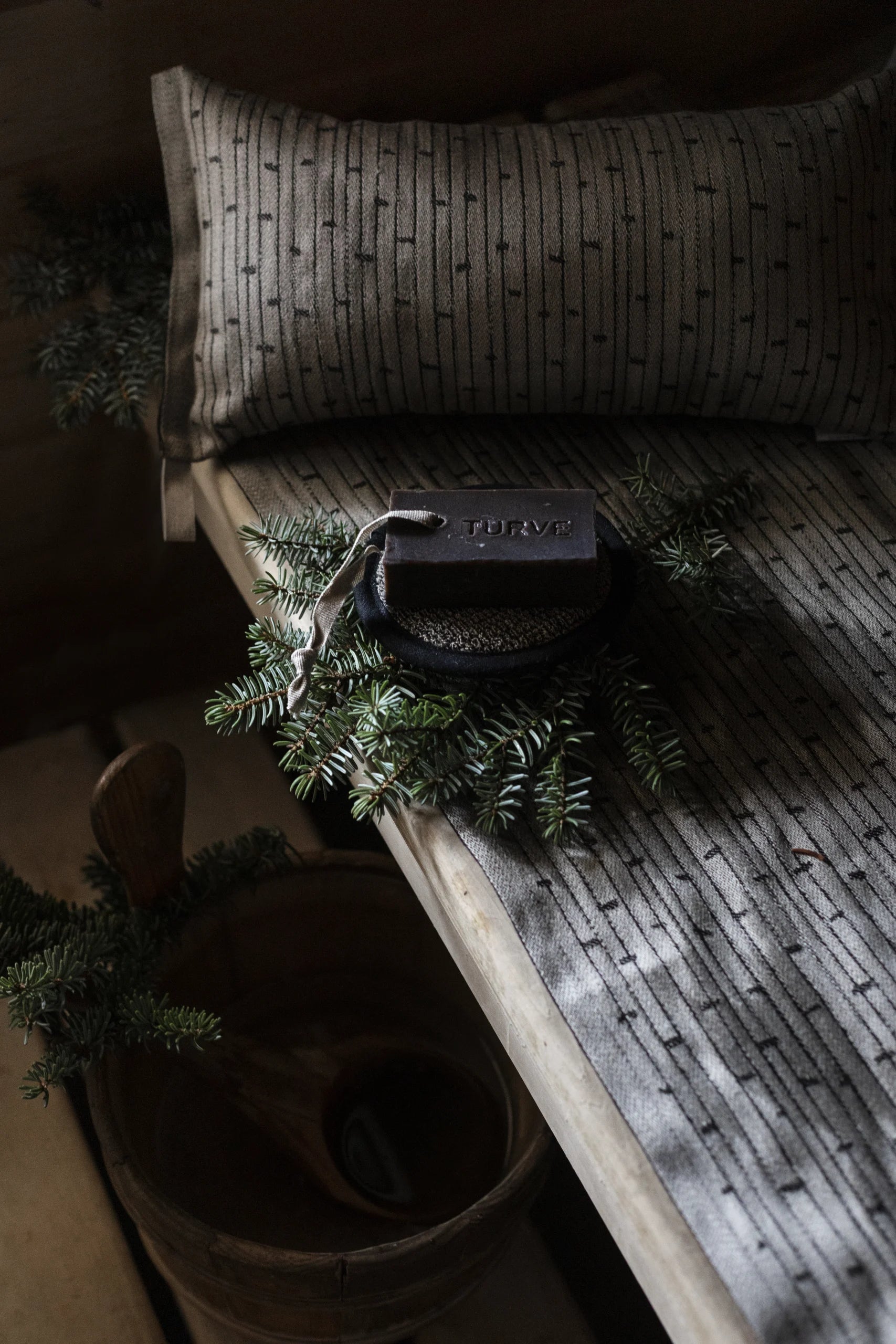 Wash the new textile before use. Delicate laundry wash at 40°C in plenty of water on a slow washing spin. Wash separately. Avoid softener and bleach. Reshape whilst damp. Do not tumble dry.The filling is 100% fire resistant polyester fibre. The colour of natural linen becomes lighter with washing. Shrinkage approx. 5 %. Keep away from the hot stove. Do not sleep in the sauna. Remember to take the textiles out of the sauna always after use, do not dry textiles inside sauna.
