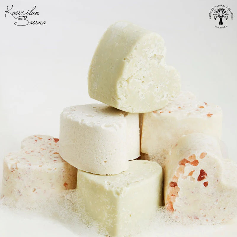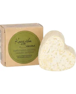 Kaurilan Sauna's Camelina salt soap is excellent for cleansing the whole body, from face to toe. It is made from high-quality Finnish camelina oil, vegetable oils and sea salt. The salt crystals melt during use and mix with the soap foam, making it gentle on the skin. The salt soap is very effective, fragrance-free and dye-free, an environmentally friendly choice for skin care.